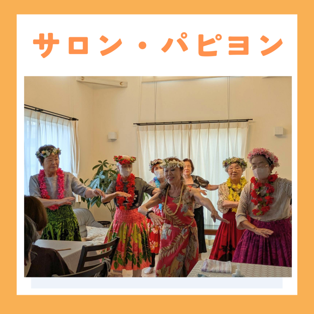 最後に出席者と一緒に踊るコーナーで5名が代表でスカート、花かんむり、レイをかけて、月の夜はをおどりました。