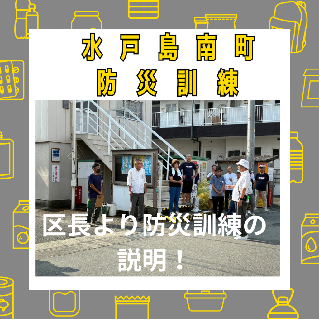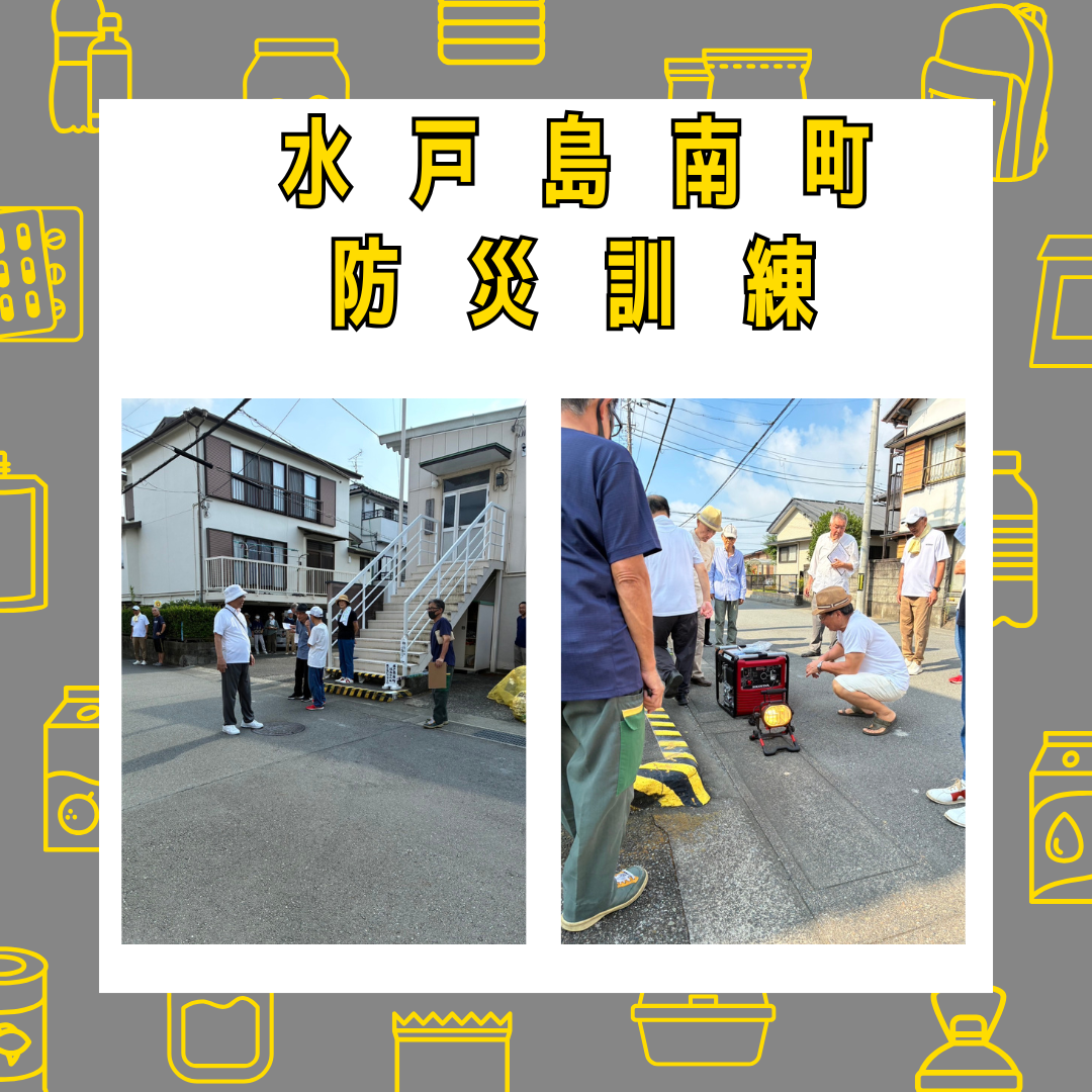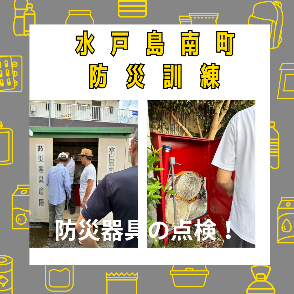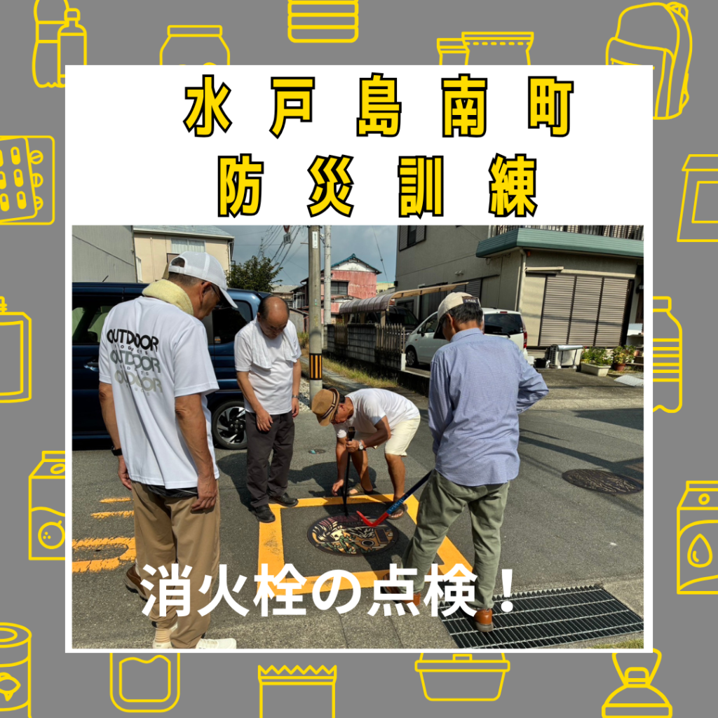 水戸島南町防災訓練 2025年10月2日 最終更新日時 : 2025年10月2日 kabufuji 9月1日水戸島南町公会堂前で防災訓練を実施しました。朝から暑い中、大勢の方が集まりました。各班ごとに安否確認シートによる班内の安否と被害状況確認。消火栓や倉庫を確認しました。また、以前より懸念のあった旧防災発電機の能力不足を補う為、新たに購入した発電機の紹介がありました。最後に区長さんから寸評を頂き解散となりました。