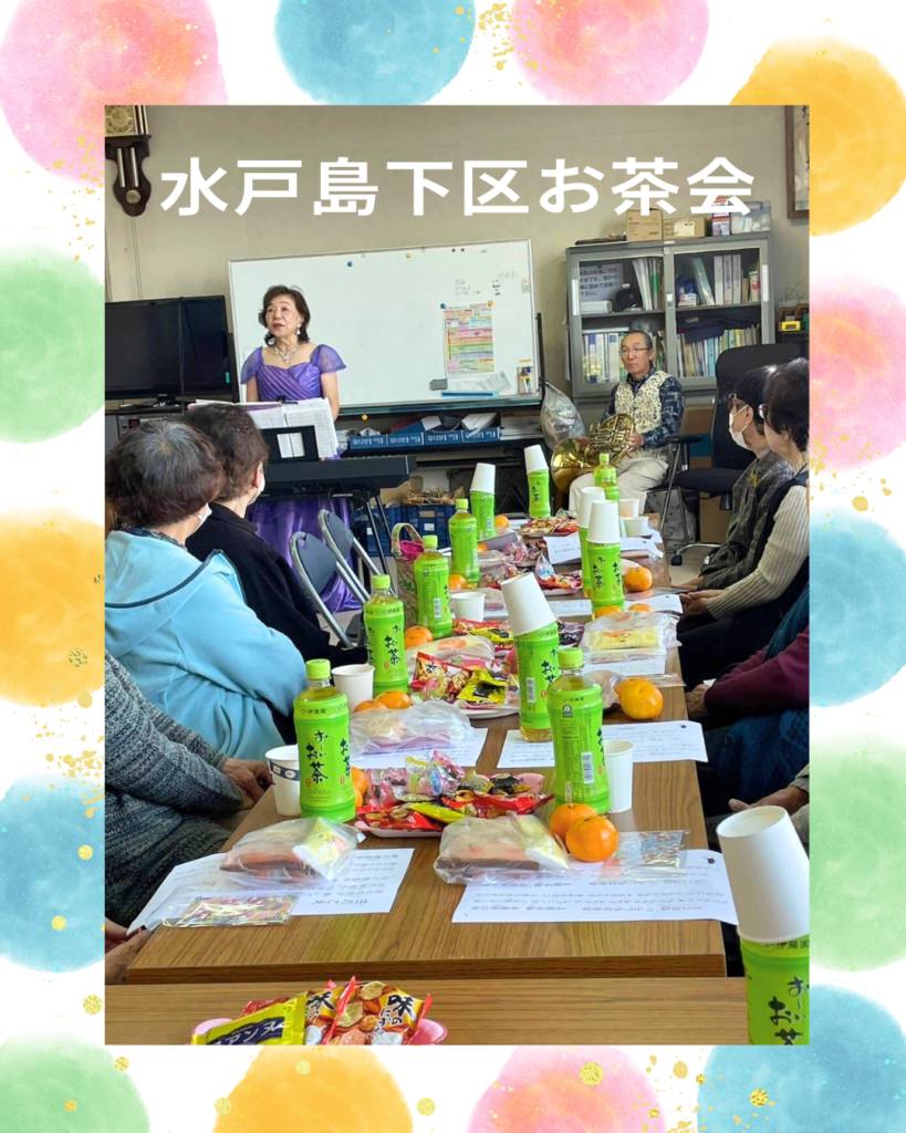 水戸島下区お茶会(水戸島下区) 2025年12月2日 最終更新日時 : 2025年12月2日 kabufuji 11月14日土曜日水戸島下区公会堂でお茶水を開きました。参加者は30名!グレイスさんの音楽で、こころを開いて頂き、笠井清美さんの笑いヨガで、上げて頂きました。たのしいひとときでした。