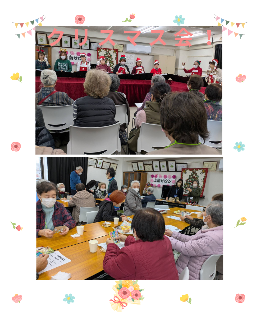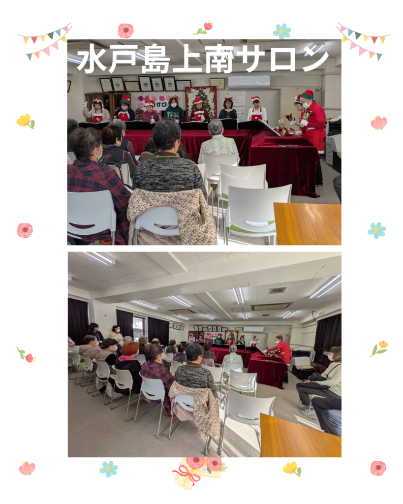 水戸島上南サロン 2026年1月12日 最終更新日時 : 2026年1月12日 kabufuji 12月18日、水戸島上南のサロンが開かれました。今年度最後のサロンはクリスマス会と銘打って、「ティンカーベル」の皆さんによるハンドベルの演奏とビンゴを楽しみました。ハンドペルの澄んだ音色に心が洗われるような気がしました。素晴しい演奏の後はビンゴ。参加者18名とボランティアも加わり次々にビンゴを完成させて、景品をゲットして、大盛り上がりでした。来年1月のサロンでの再開を約して閉会としました。