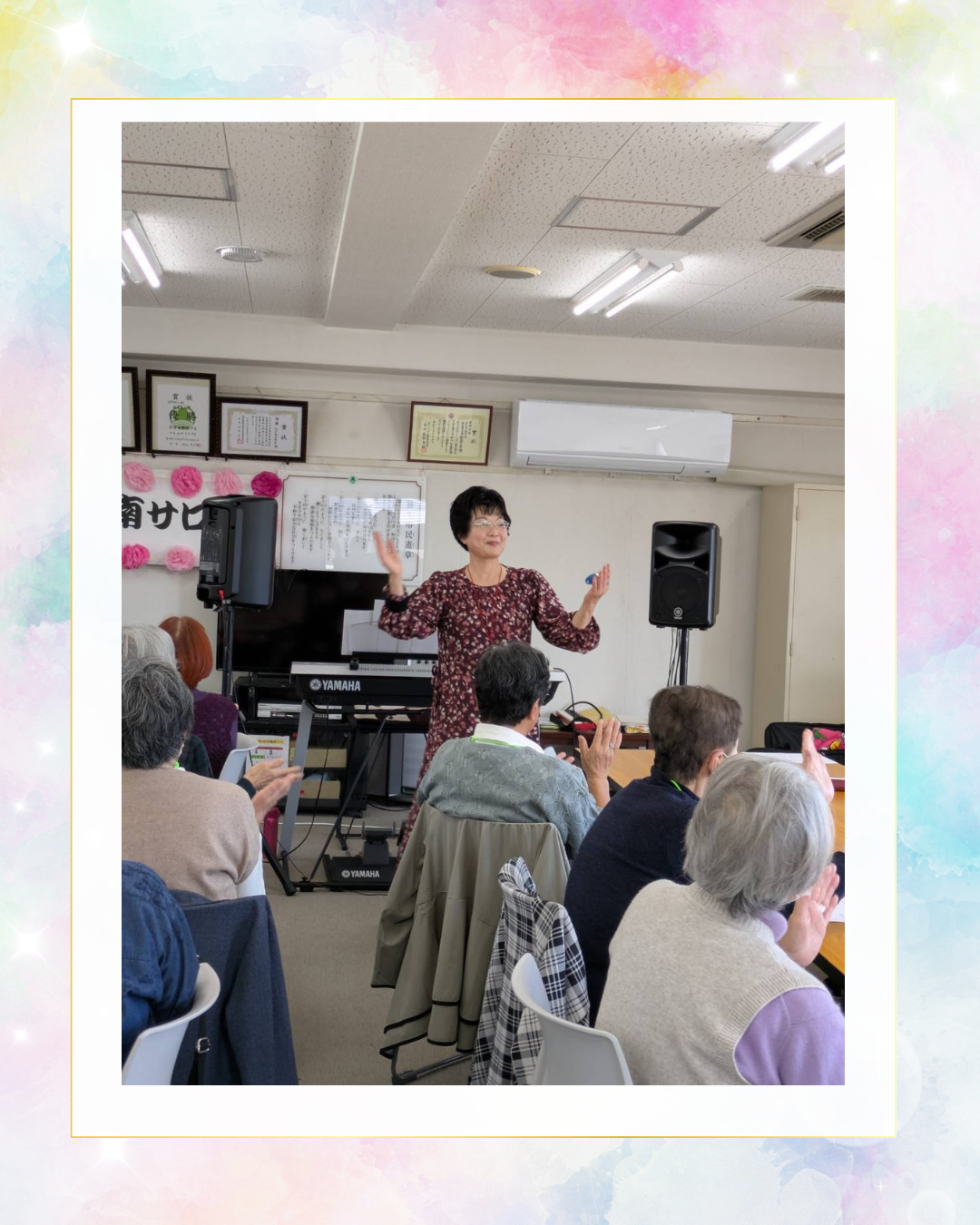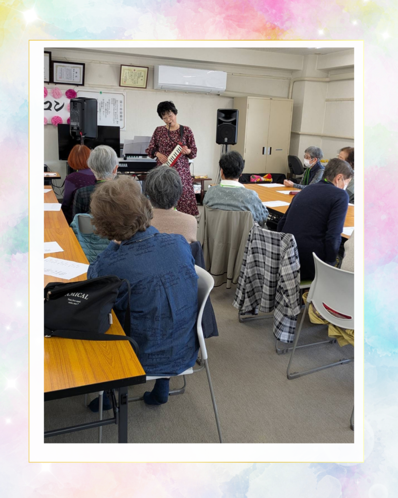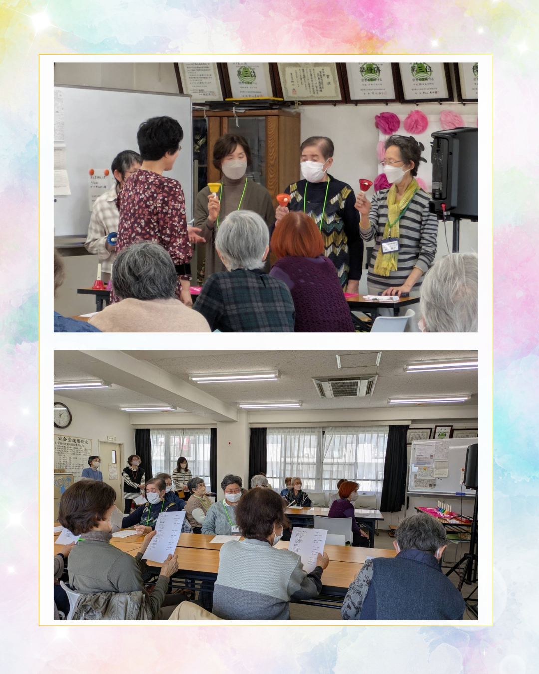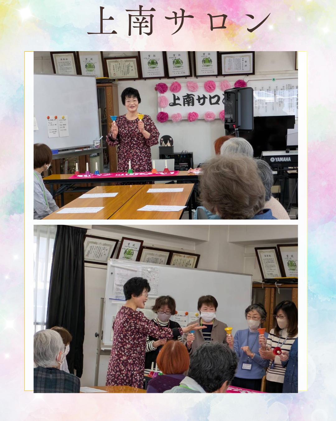 後半にはサロンの出席者がメロディーベルに挑戦。『ちょうちょ』『チューリップ』を演奏し最後に全員でカラフルなボタンやプラスチックの可愛い小物の入ったペットボトルや空き缶を振って『ヘイジュード』を演奏して音楽会を終了しました。