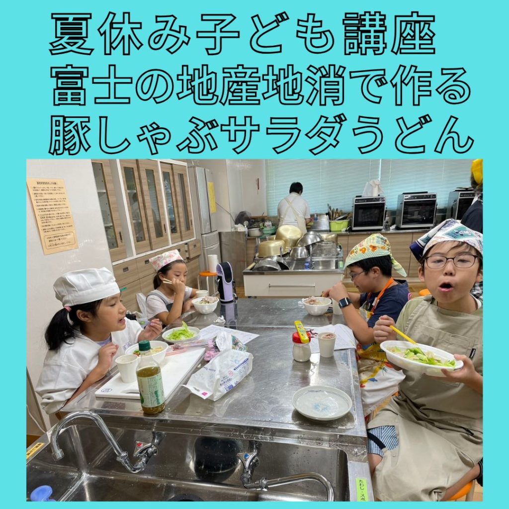 夏休み子ども講座(富士地産地消) 2025年9月6日 最終更新日時 : 2025年9月6日 kabufuji 8月18日(月)『富士の地産地消で作る、豚しゃぶサラダうどん』マクロビデオイック料教室を主宰する平戸さんによる講座。うどんの麺つくりに挑戦しました。もちろん、うどん作りの初心者ばかりで、大きさもいろいろ野菜の盛り付けも個性豊かでした。保護者からのメッセージ→きらきらの笑顔で帰って来て、『うどんの麺を作るところからだったよ-----』と教えてくれました。貴重な機会を作っていただき感謝致します。