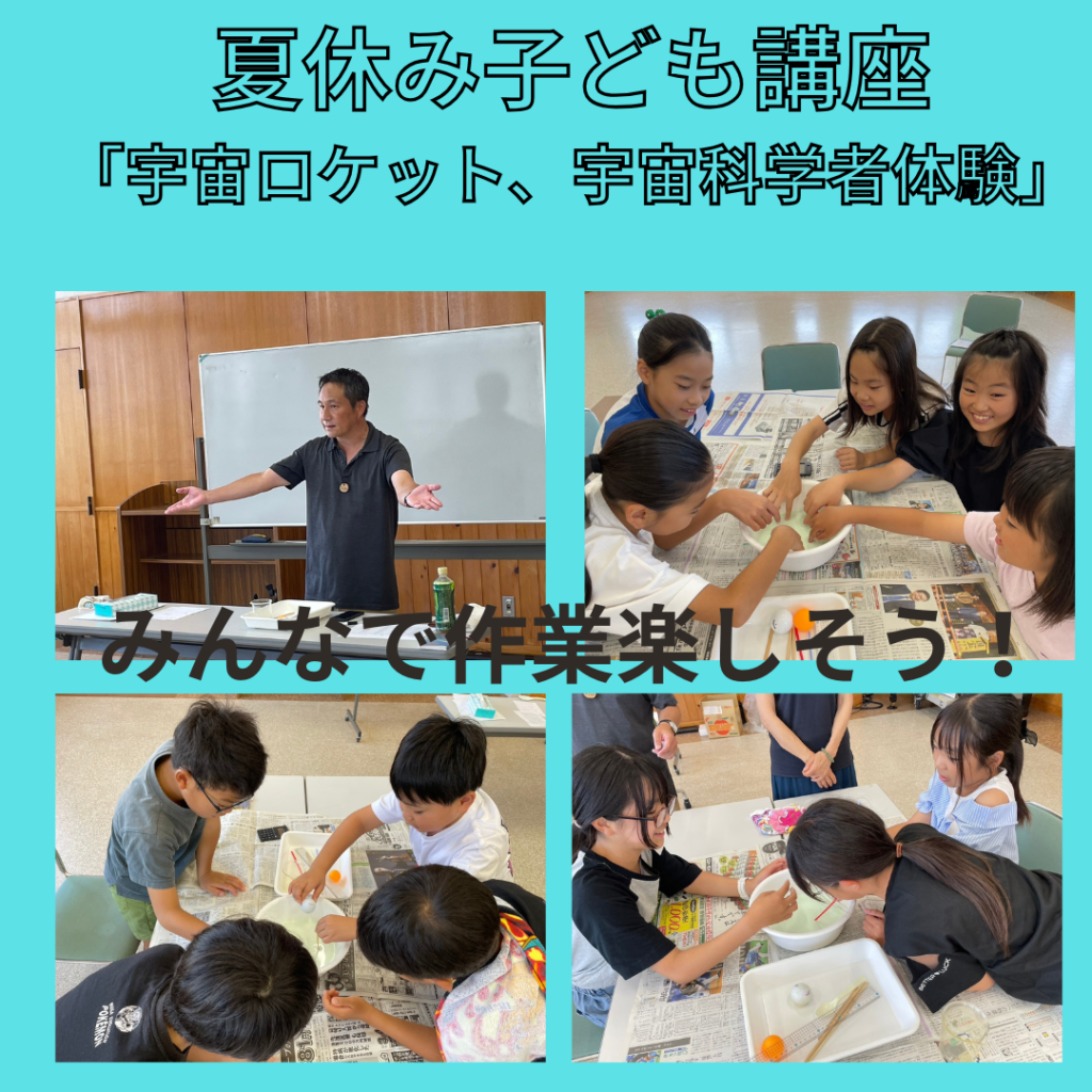 夏休み子ども講座(宇宙ロケット・宇宙科学者体験) 2025年9月6日 最終更新日時 : 2025年9月6日 kabufuji 「夏休み子ども講座(宇宙ロケット・宇宙科学者体験)」まっちゃんこと松下さんによる講座。化学者がどんな考え方やアプローチで研究開発しているのかを学びました。緑色のネバネバの不思議な液体に手でさわってみたり、ストローて吹いてみたりして、科学者になったつもりで、調査! 考えたり調べたり意見を出し合ったり..その過程が大切! グループごとに考えて設計したロケットも、子どもなりのアイデかいっぱいでした。参加した子どもたちみんな「たのしかった~」と満足して笑顔で帰っていきました!