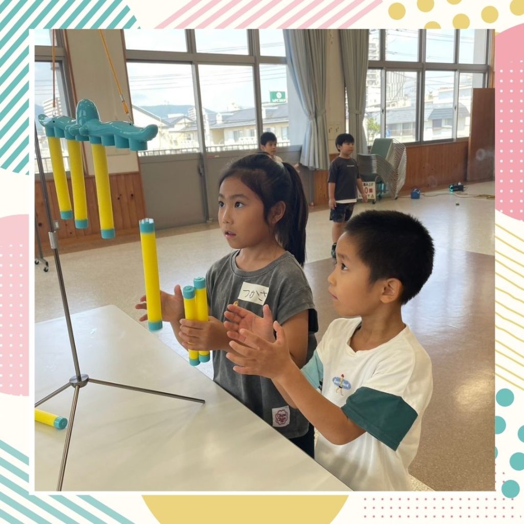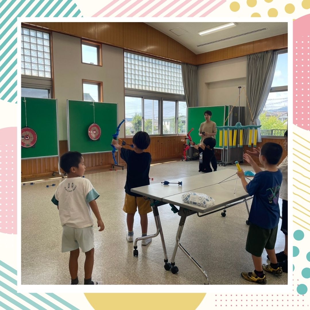 ②先生持参の遊び道具(j的宛て、フリスビー・空気砲・落ちてくる棒つかみ等)を今日初めて会う友達と声をかけあったり、応援しながら遊ぶ姿に、ちょっと感動!表も大活躍です。