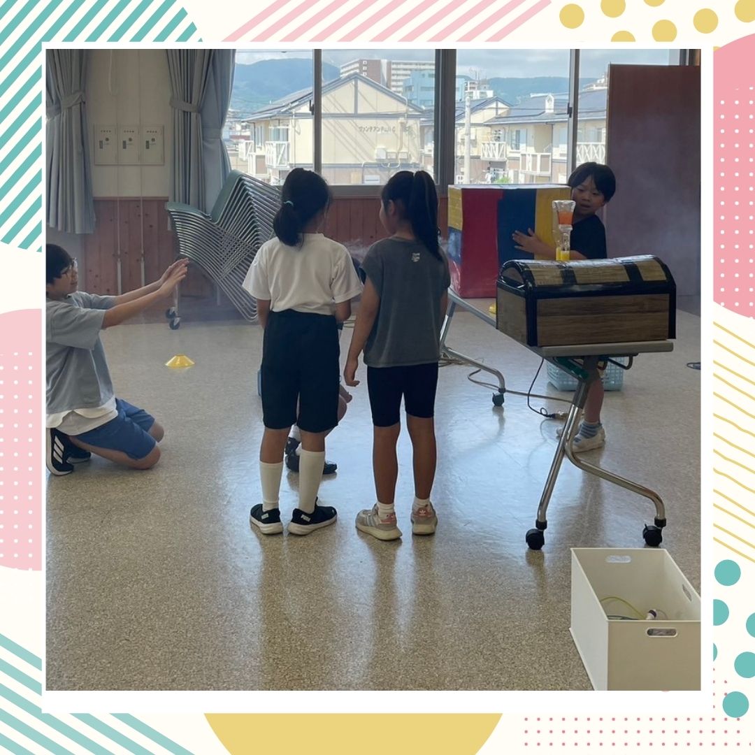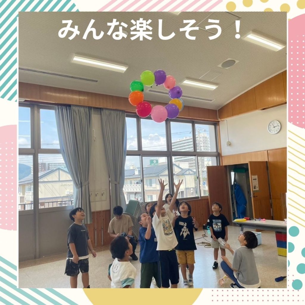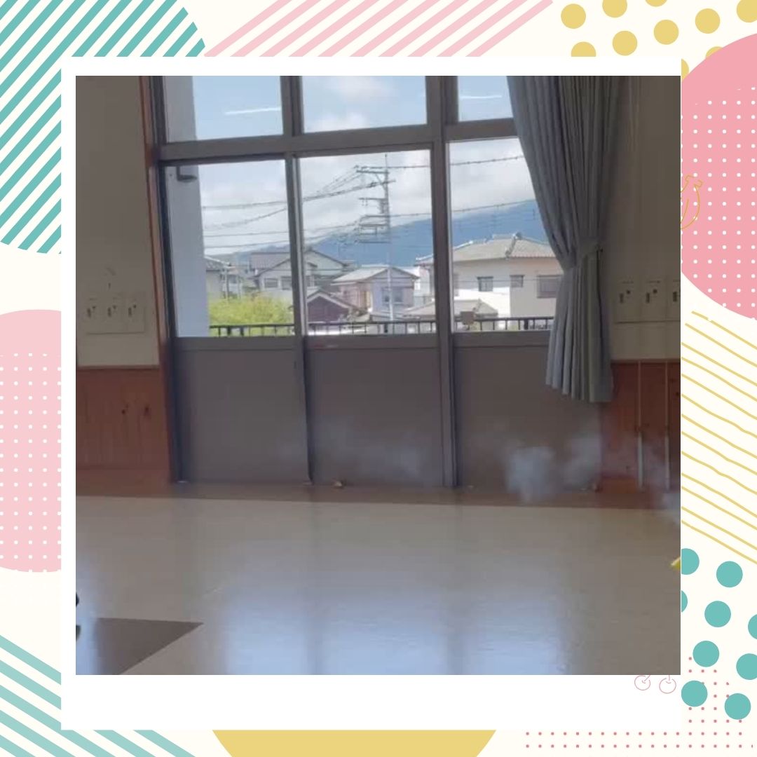 ③丸く繋げた風船(『アッ、ポンテリングだ』の声)をフロワー(風を送る機械)を使って飛ばす。⇒上手に回るように風船の並び方・風の向きなどを考えら最後はクルクル回り、最後に歓声が上がり拍手喝采でした。