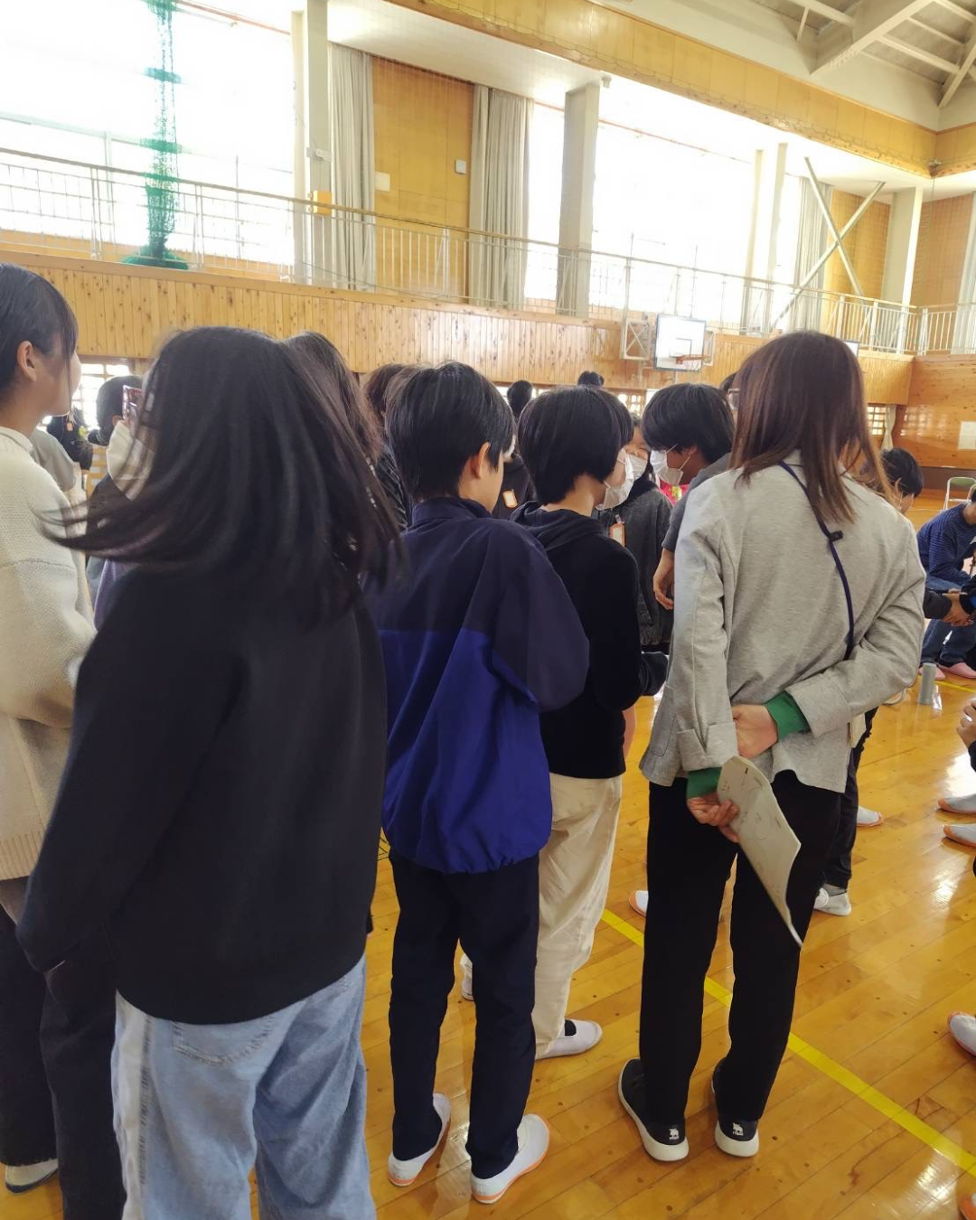 6年生と、地域の方々が二重円になり向かい合い外側が6年生・内側の円が地域の方々です。