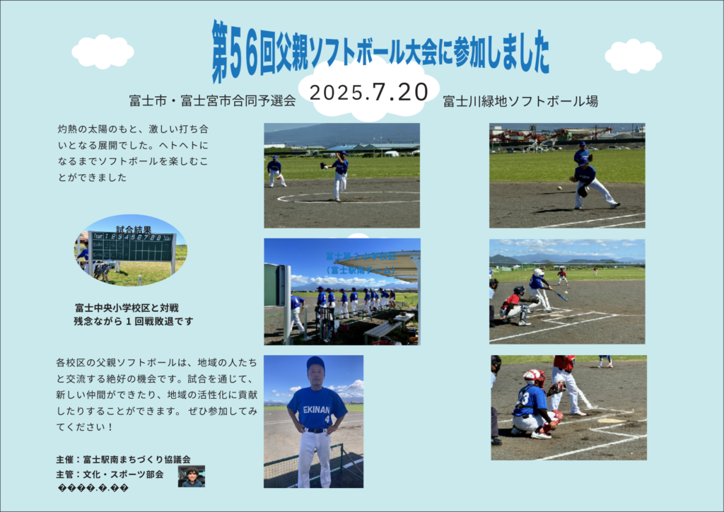 父親ソフトボール大会2025.7.20 2025年8月21日 最終更新日時 : 2025年8月21日 kabufuji 富士駅南まちづくり協議会・文化スポーツ部会が企画しました父親ソフトボール大会に参加しました。酷暑の中、日頃の練習をふるに発揮できたと思います。みなさまお疲れ様でした。