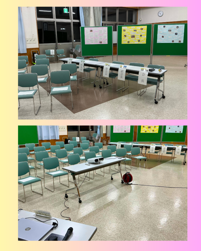 今回は映写膜が壊れて使用出来なかったのでホールの壁を使うレイアウトにしました。